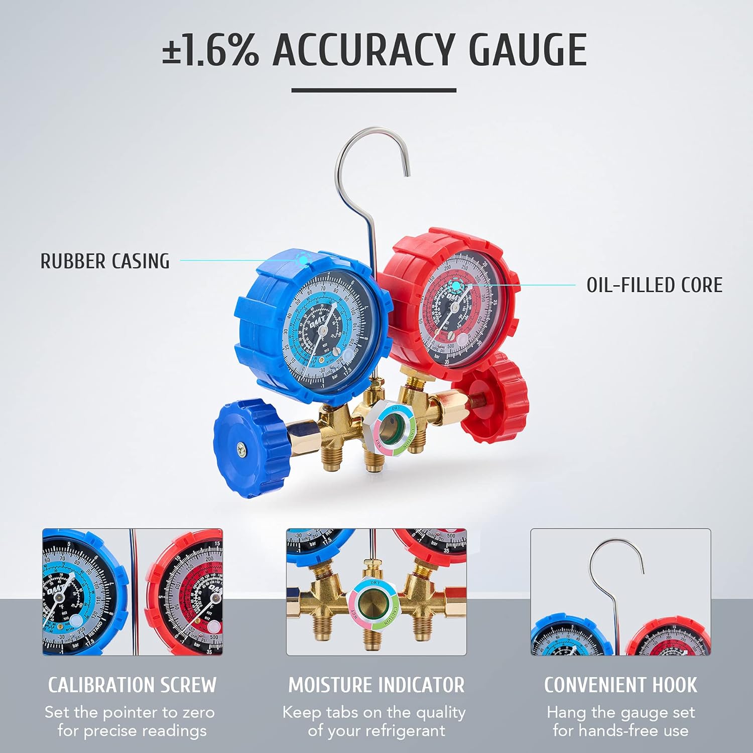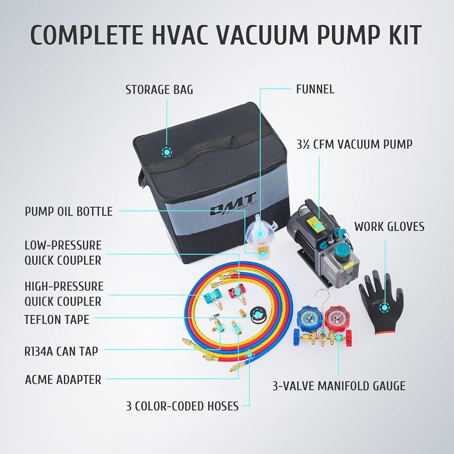 Orion Drive Tech AC Gauges and Vacuum cleaner Heart 3 Way Ac Gauge Set with 38 Micron Air pump 3.5cfm AC Vacuum Pump and Gauge Set with Atomic number 89 Manifold Gauge for R134a R12 R22 R502a